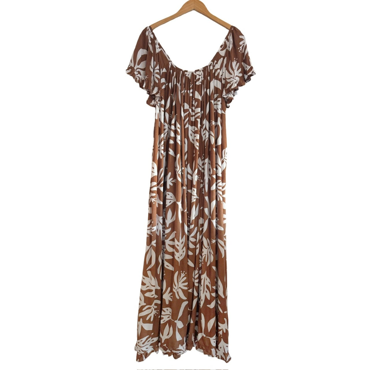 Long mu'u with loose fit and low back, ruffle at sleeves and hem