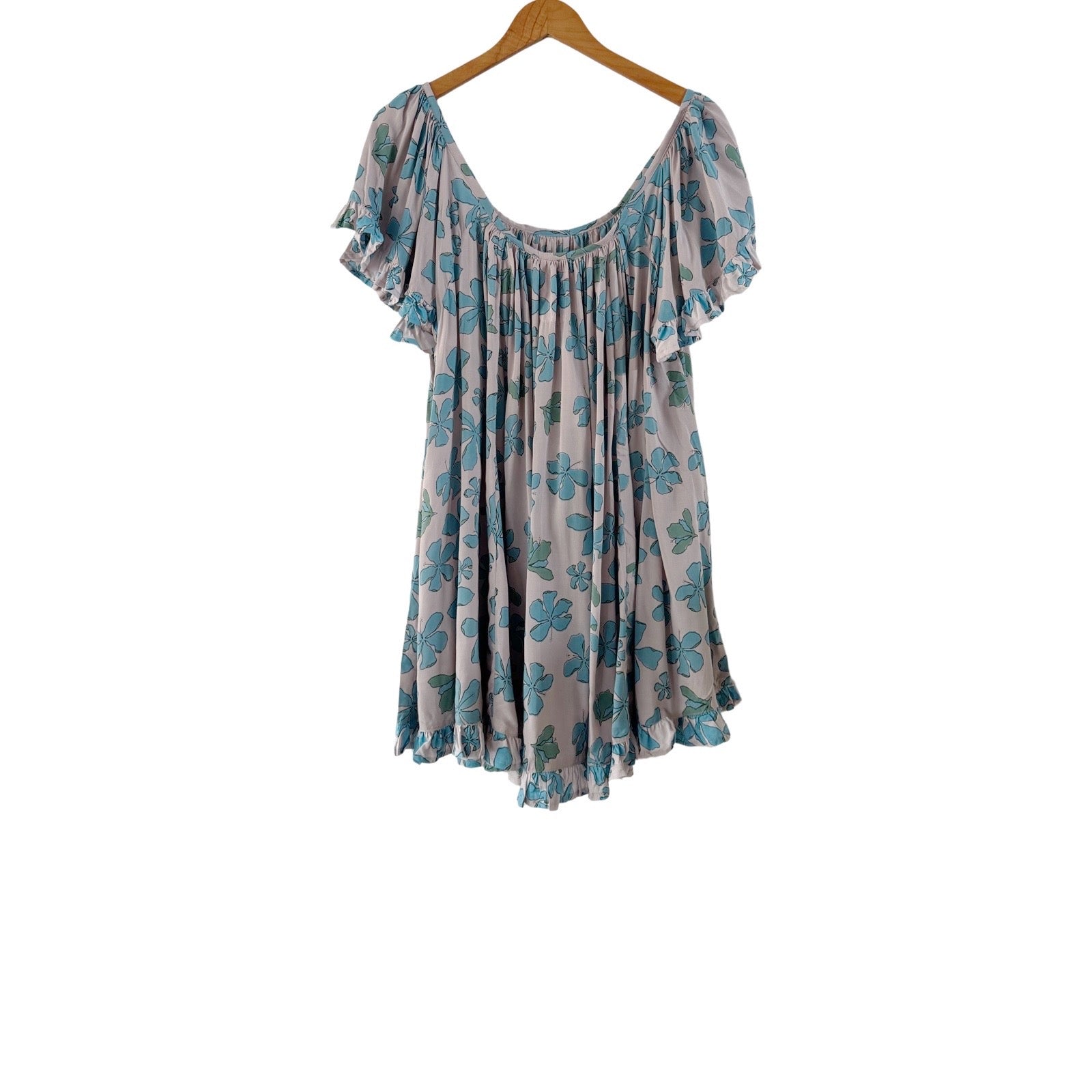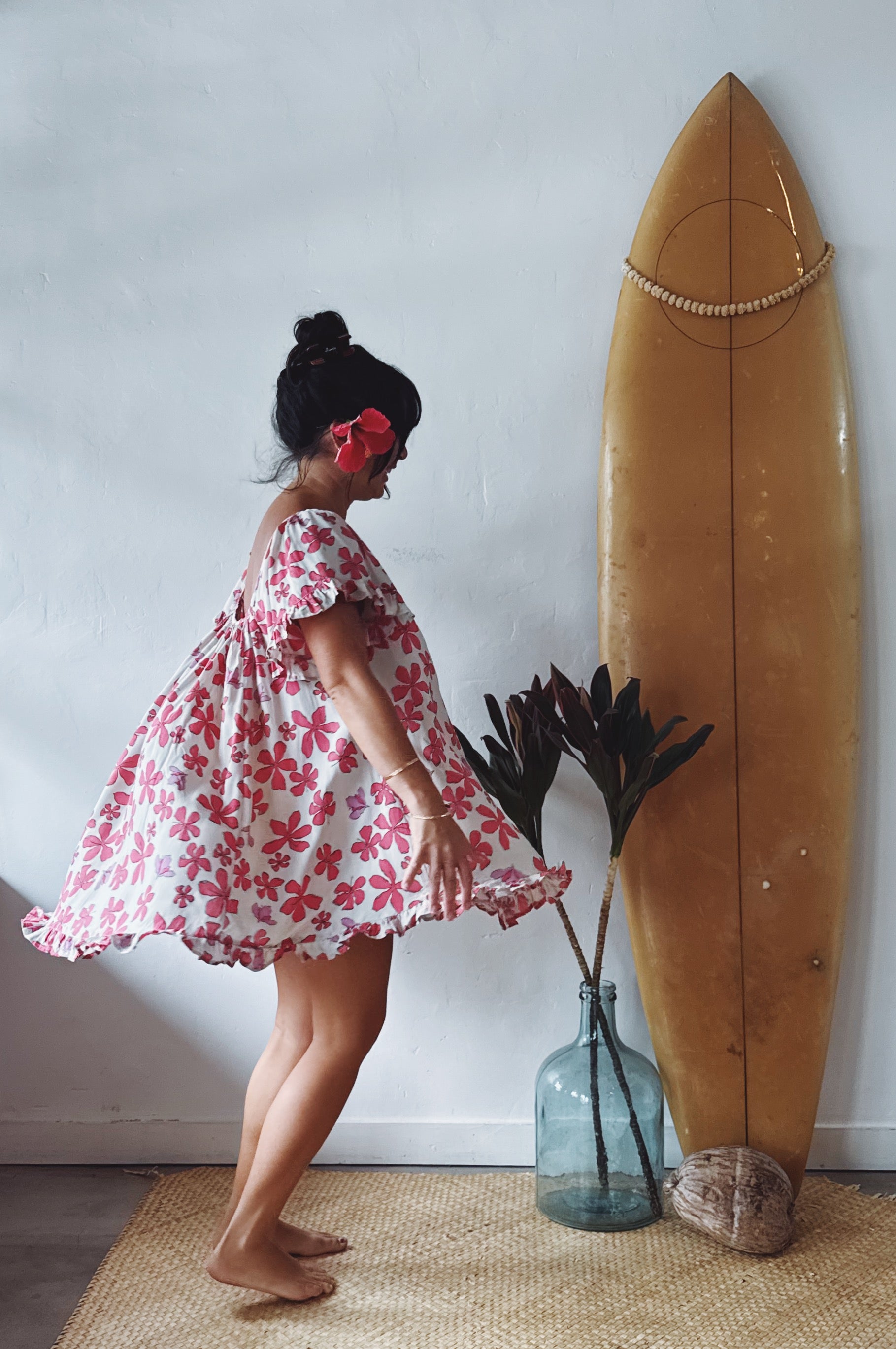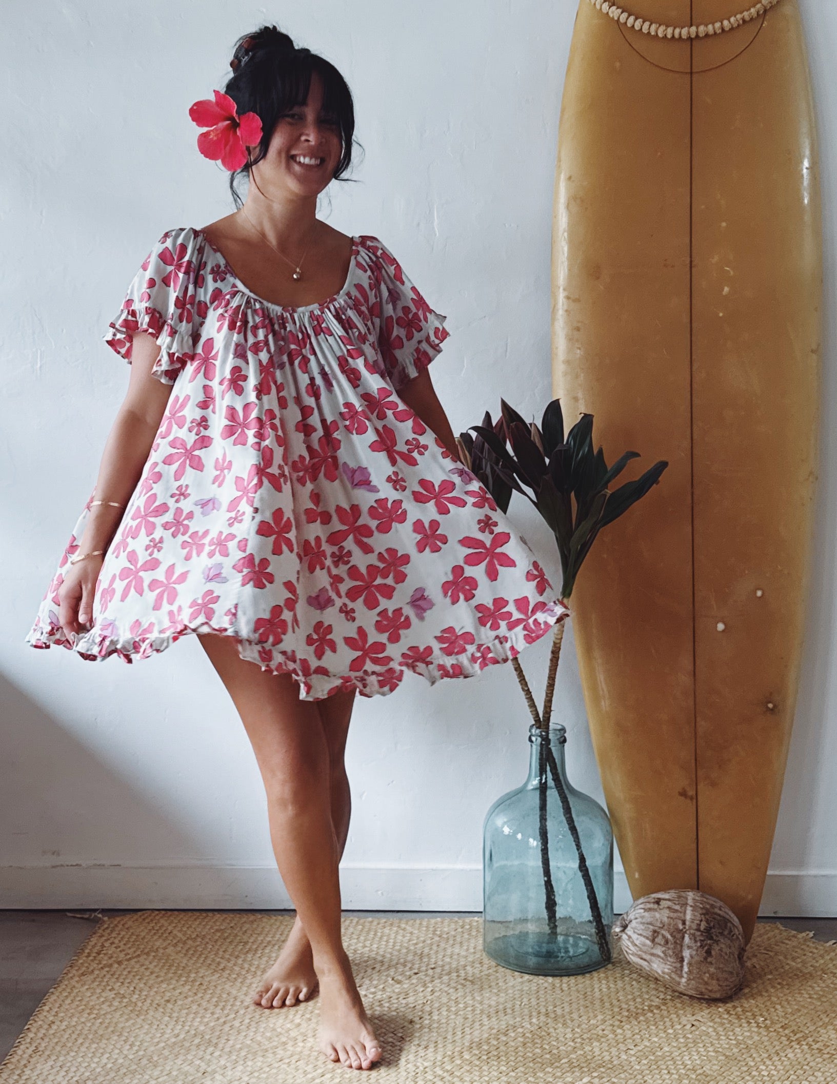 Mini mu'u with loose fit and low back, ruffle at sleeves and hem
