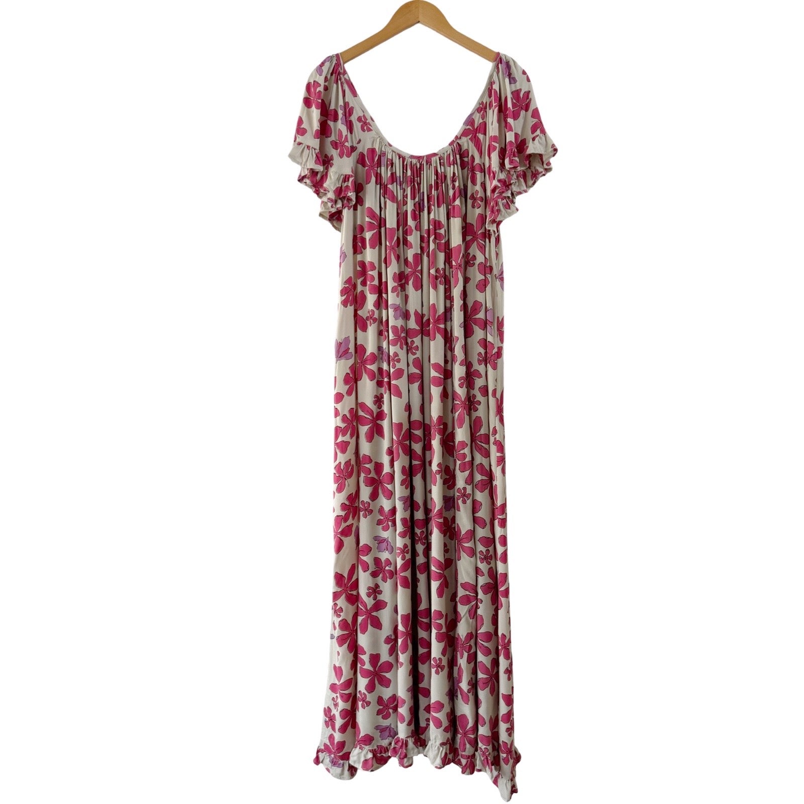 Long mu'u with loose fit and low back, ruffle at sleeves and hem